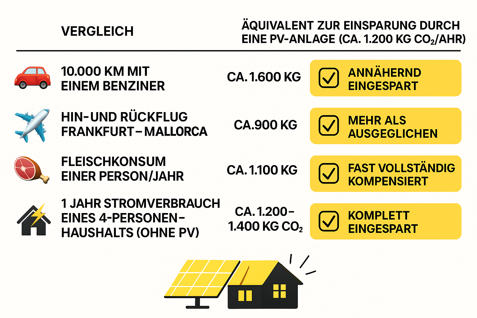 🟡 Eine typische PV-Anlage spart jährlich ca. 1.000–1.500 kg CO₂.
